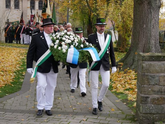 In seinen abschließenden Worten nach der Niederlegung eines Gedenkkranzes dankte Oberst Alfons Schweins der Stadtkapelle Geseke, Pfarrer Rainer Stahlhacke und Pfarrerin Kristina Ziemssen sowie den zahlreichen Fahnen- und Vereinsabordnungen für die Teilnahme.