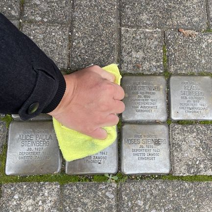 In Erinnerung an die Opfer der Reichspogromnacht legte Bürgermeister Dr. Remco van der Velden im Namen von Rat und Verwaltung Blumen am Gedenkstein am Alten Steinweg nieder, der an die in den 1950er Jahren abgebrochene Synagoge erinnert und reinigte die bereits verlegten Stolpersteine für die Familien Kronenberg und Steinberg.