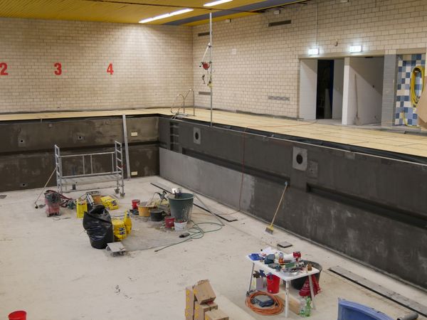 Nachdem der Förderbescheid für die Erneuerung des Hubbodens und gleichzeitiger umfassender Sanierung des eigentlichen Schwimmbeckens aus dem Infrastrukturmaßnahmenpakt der Landesregierung NRW im Juni vorlag, hat das städtische Gebäudemanagement die umfangreichen Arbeiten vorbereitet, ausgeschrieben und vergeben. Inzwischen ist die Technik für den neuen Hubboden bereits installiert, zurzeit wird das Becken abgedichtet. Im Anschluss erfolgen die Fliesenarbeiten an den Beckenwänden.